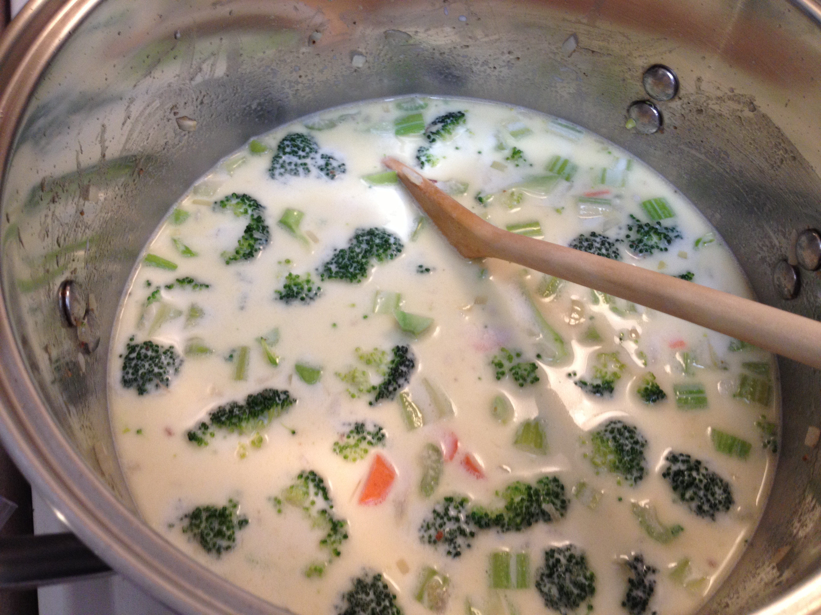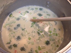 After you’ve let the vegetables cook for a few minutes (5 or so), add the milk and the cream. Reduce the heat to medium and start stirring.