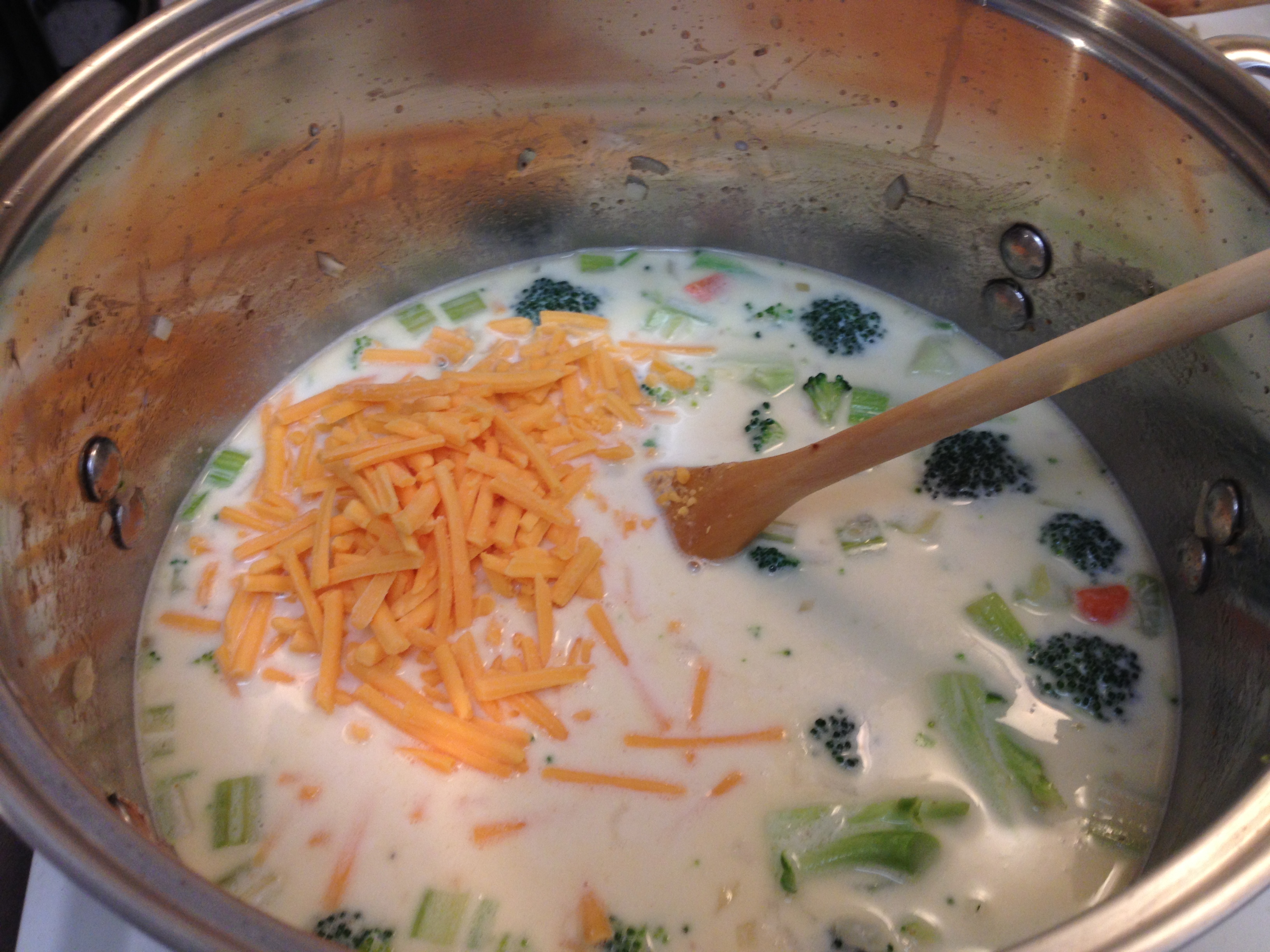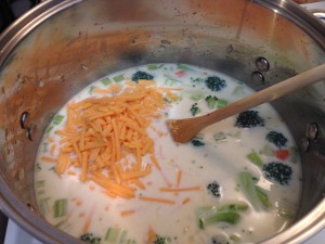 As the soup warms up, add the cheese. I added mine too early, right after the milk and cream, and the cheese mostly sank to the bottom and melted there. It turned out alright in the end, but it’s certainly something that can wait a few minutes.