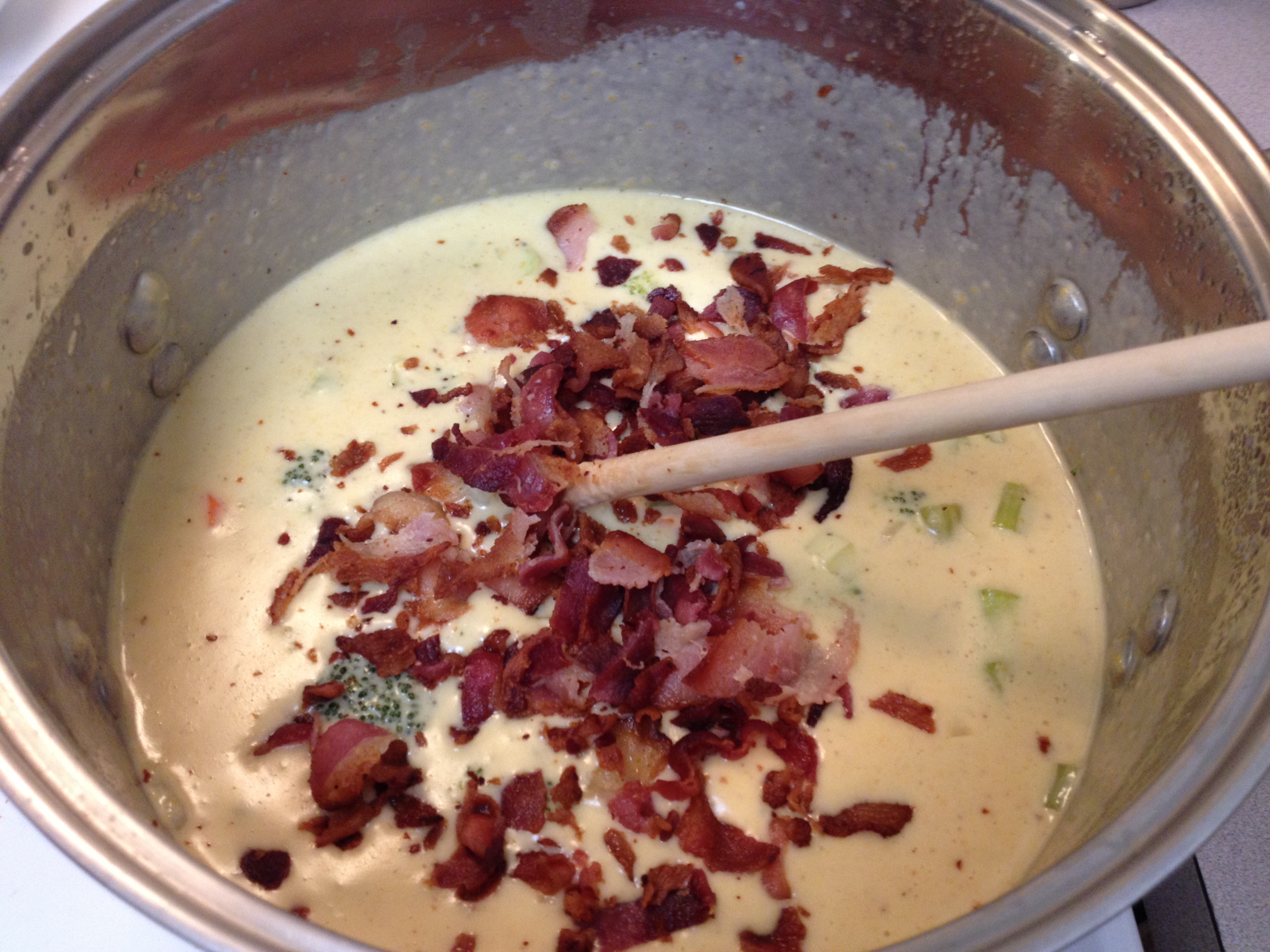 Sprinkle your broken up bacon on top and stir it in. Take a moment to marvel at the beauty that is bacon.