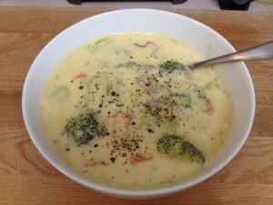 There are a handful of soups out there that I want to make one of these days. Seafood asparagus bisque, chicken enchilada, and broccoli cheese, among others. After crossing clam chowder off the list with an awesome recipe a few weeks ago, I decided to riff on that recipe and modify it for broccoli cheese soup.